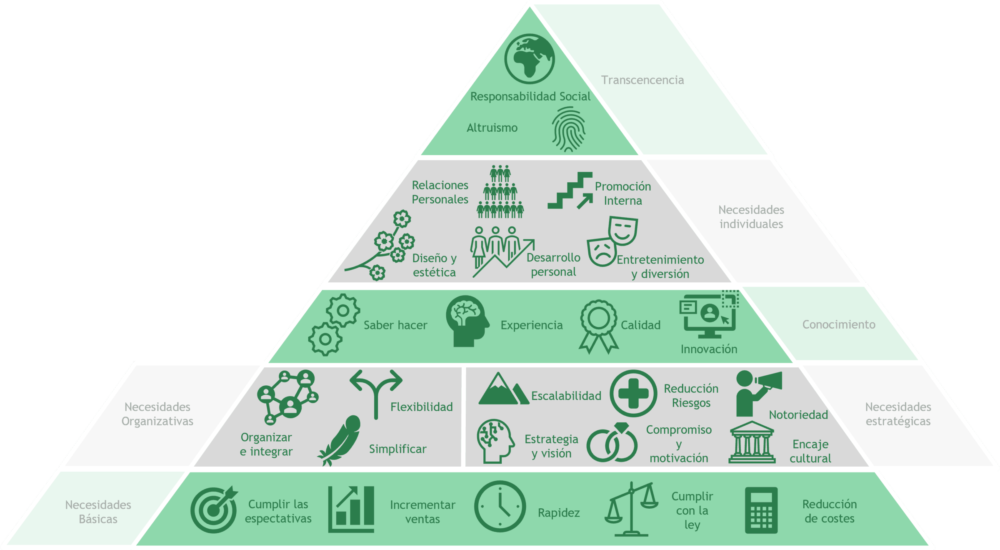 También pertenecen al campo corporativo las denominadas necesidades estratégicas, que se refieren al efecto de la solución o producto ofrecido hacia la orientación de la empresa, a medio y largo plazo. Aquí la reflexión de valor gravita en torno a aspectos como la gestión de riesgos, el compromiso y el encaje a largo plazo de las personas, o de la visión. La dirección de la empresa será, evidentemente, quien valore esta necesidad.
